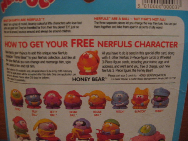 Burger King held a Nerfuls promotion just about the time that Parker Bros. had decided not to make Nerfuls anymore. There were four Kid's Meal boxes and four Nerfuls released (Bitsy, Fetch, Scratch, Officer Bob). The figures are identical to the store-bought figures except for a Burger King stamp on their bottom and an adjusted year stamp.